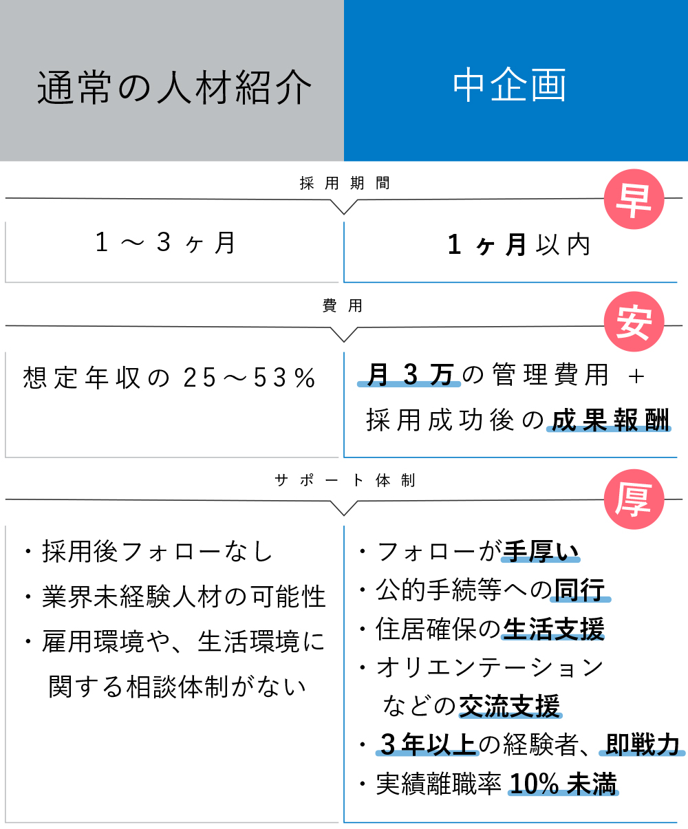 受け入れに必要な支援期間は「中企画」にお任せください! 特定技能人材雇用時は、受入企業に対し外国人支援が義務化されています。 中企画にお申し込みいただくと、受け入れ後の支援義務をフルサポートいたします。