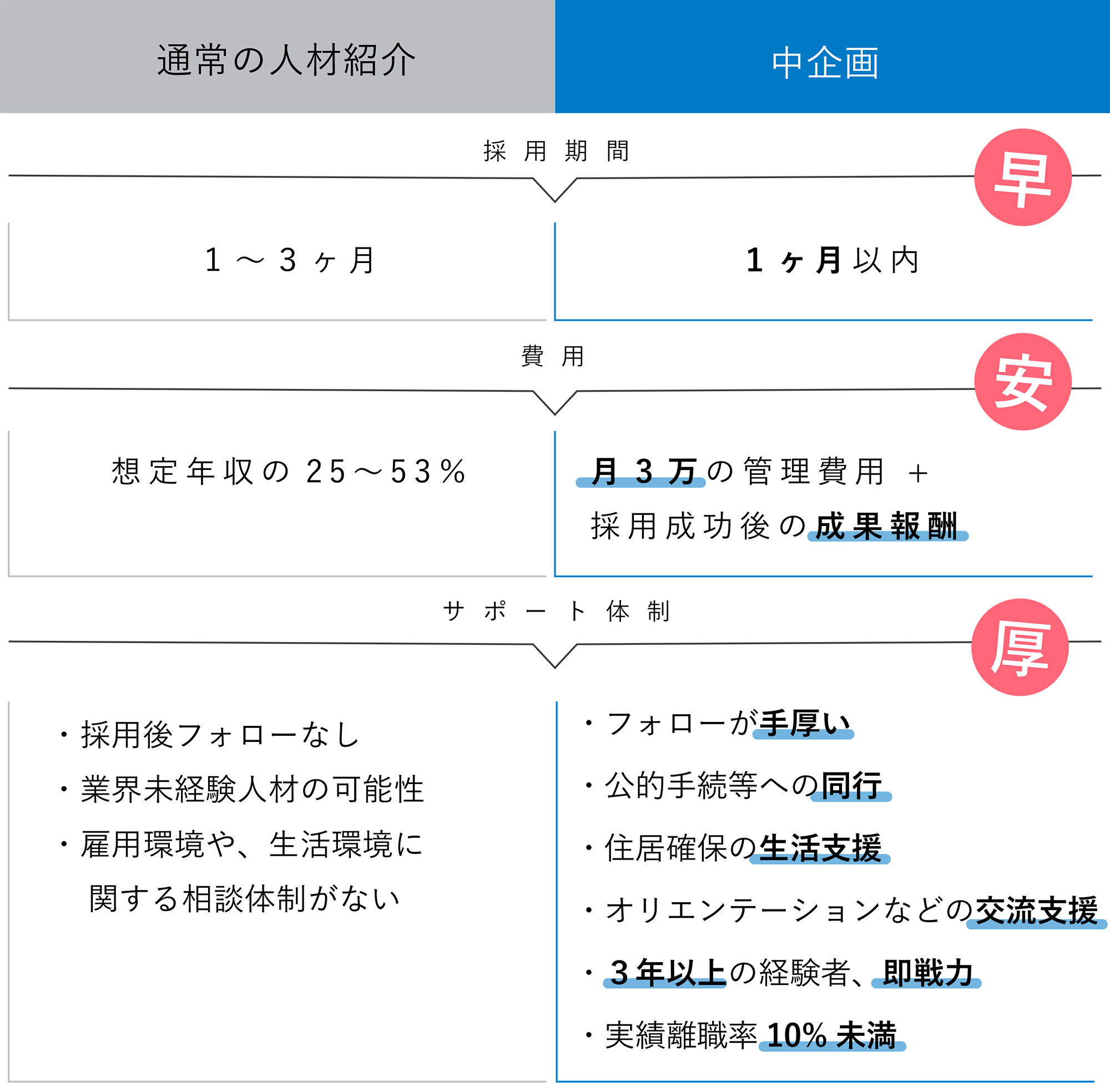 中企画なら「シンプル・明確。わかりやすい。」 一つのプランで手間を減らしつつ、コスト削減と採用を実現します。